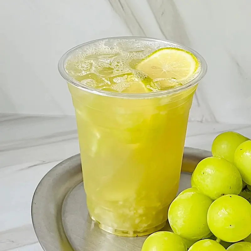 Add 30g of Green Grape Concentrate with Real Fruit Pulp, 150ml of brewed tea, 15g of fructose, and 150g of ice cubes. Garnish with two slices of perfume lemon. 700ml serving size.