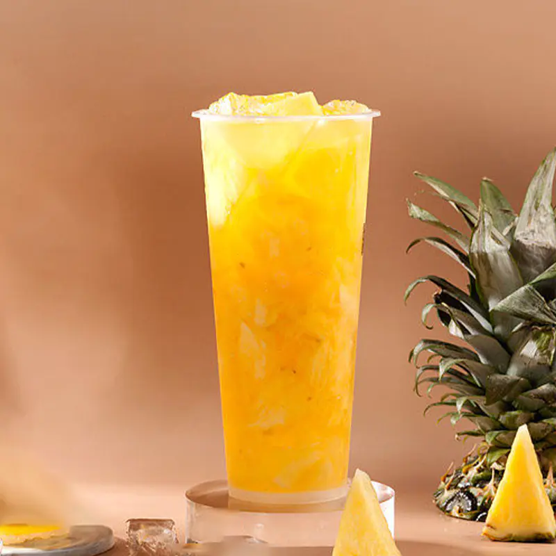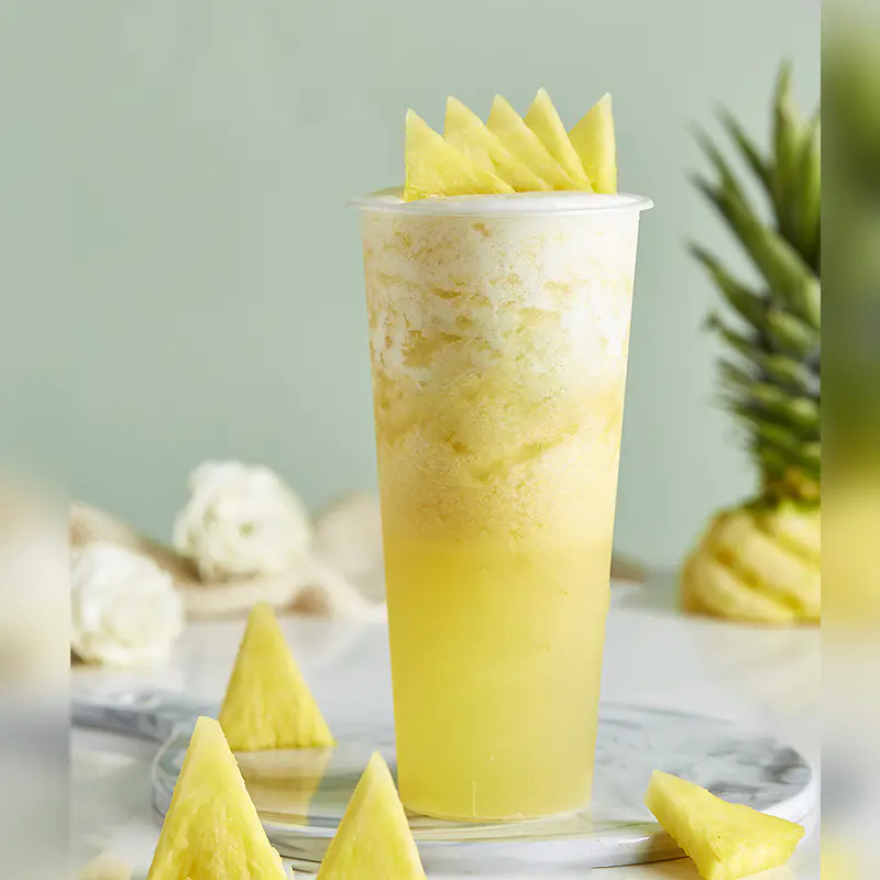 Add 30g Pineapple Honeydew Melon Concentrate Syrup, 150ml brewed tea, 15g fructose, 150g ice, 2 slices of fragrant lemon, and 20g pineapple chunks. 700ml serving size.